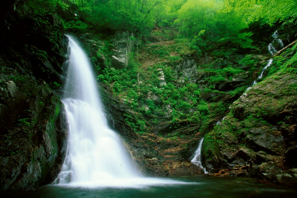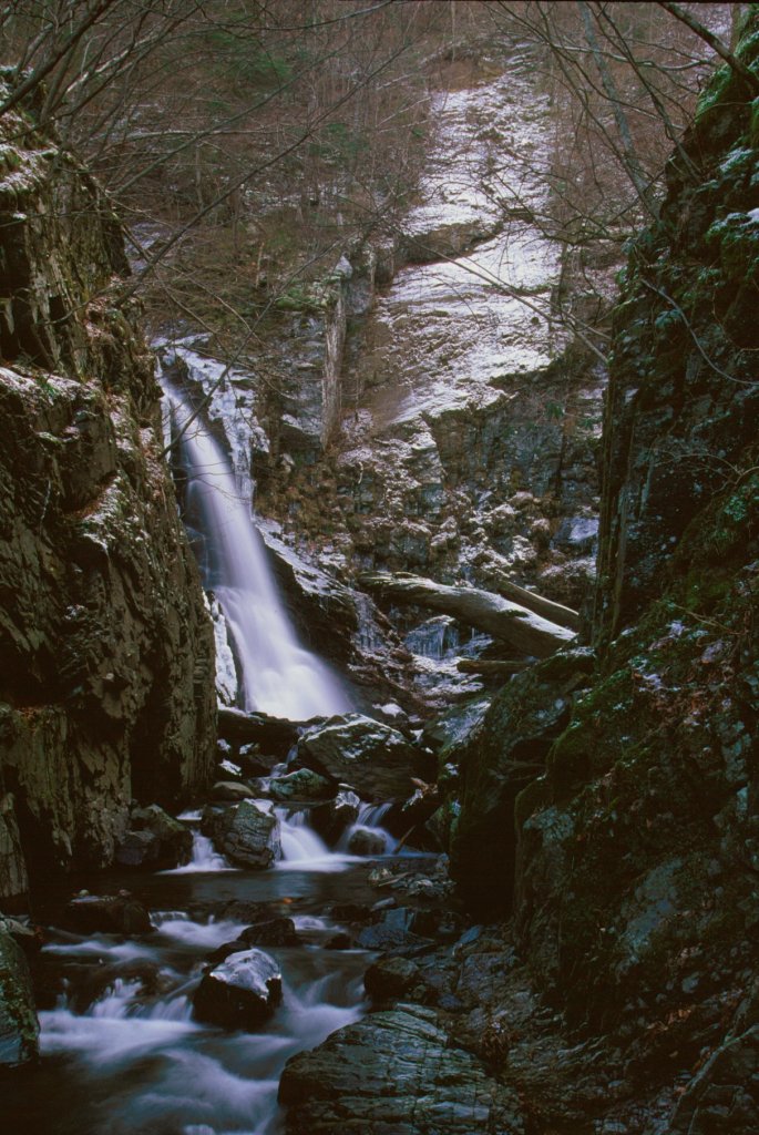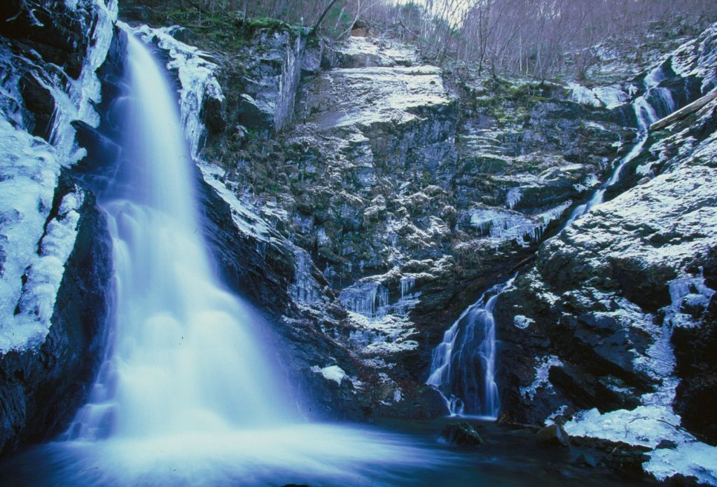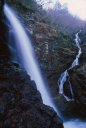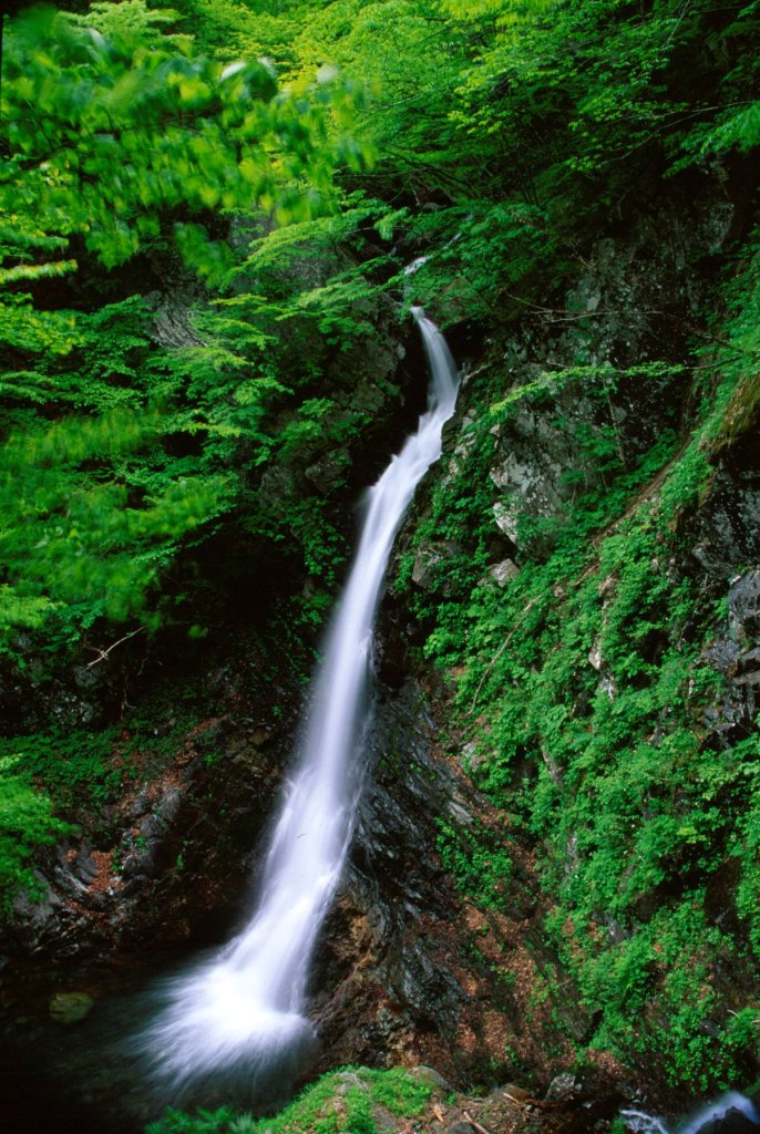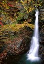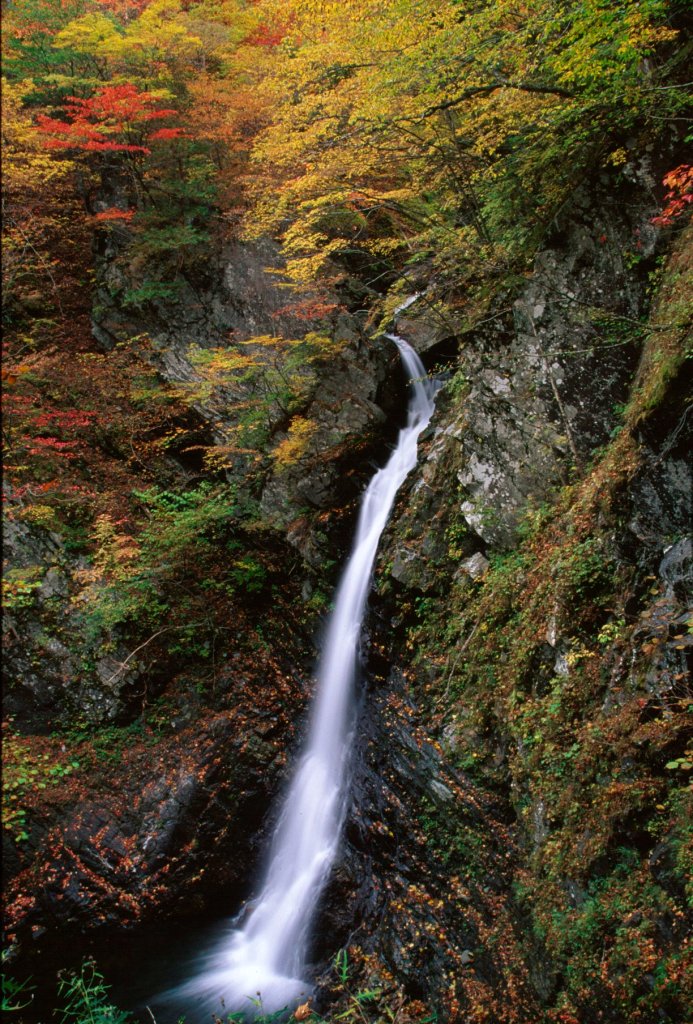 | 「大滝」は経ヶ岳登山道の大滝沢ルートの途中にあります。注意※経ヶ岳登山道大滝沢ルートは現在使用不可 大滝沢から流れ落ちる高さ25メートル、幅3メートルの「男滝」と大久保沢から流れ落ちる高さ40メートル、幅3メートルの「女滝」という二つの滝の総称が「大滝」です。水量の豊富な「男滝」に対比して、流れ落ちる姿の優雅さから「女滝」と呼ばれています。二つの異なった沢から同じ滝壷に流れ落ちる珍しい滝です。秋は水量が少なくなりますが、周辺は素晴らしい紅葉が見られます。 |